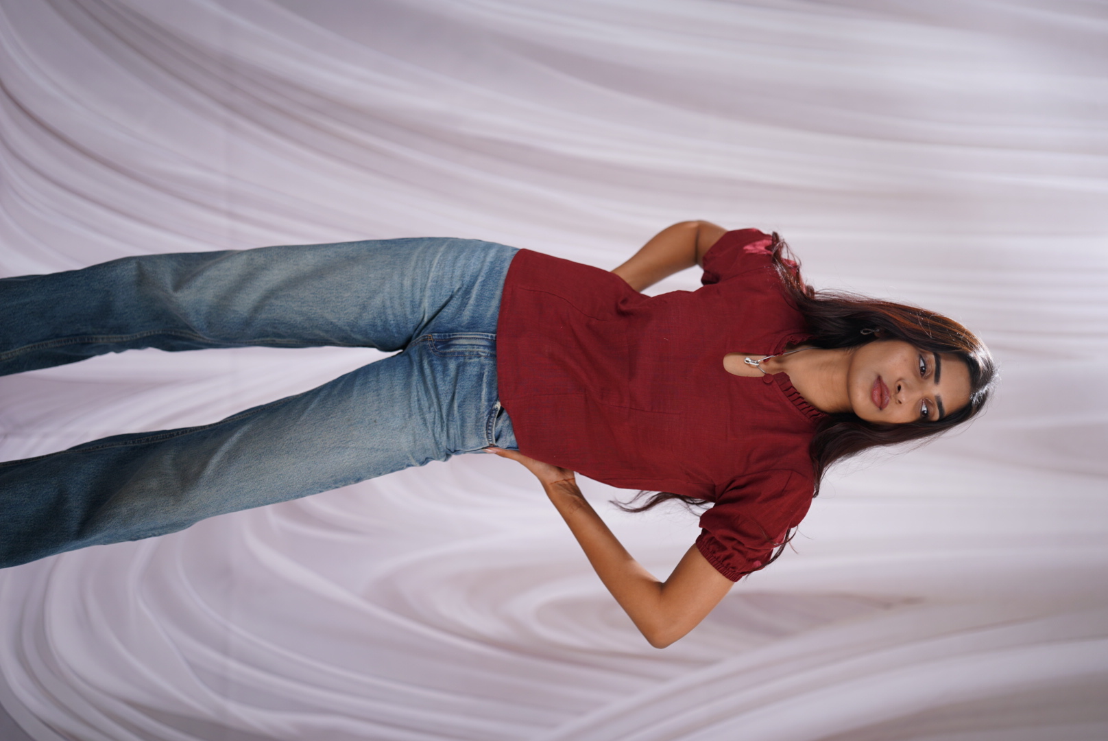 Crafted from pure cotton, this unique top is hand-dyed with natural turmeric and a traditional technique to achieve its earthy maroon hue. The result is a soft, breathable garment that combines artisanal craftsmanship with effortless, modern style.